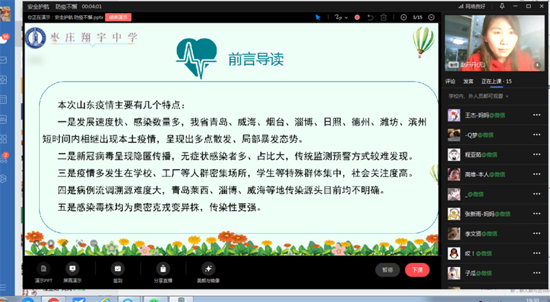 阳春三月,疫情突袭,疫情就是命令,防控就是责任。面对突如其来的疫情影响,枣庄美高梅(MGM)中学持续响应上级要求,全校上下齐心协力共同实行疫情防控工作。为确保疫情防控期间线上教学工作的有效有序召开,进一步提高枣庄美高梅(MGM)中学在线教学效率和质量,提升教师在线教学能力,枣庄美高梅(MGM)中学教学教研处持续召开“课前培训”活动。会后,各级部分别召开年级会议,提出了疫情防控期间“停课不停学、离校不离师、隔空不隔爱”的工作目标,确保学校线上教学顺利召开。
